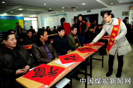为了让更多的员工知道此次活动,该公司工会提前一周在公共场所张贴了广告,在OA网发布消息,并进行大力宣传。活动当天,不少员工早早来到写春联场地,排队等候领取。在写春联现场,只见该公司十余名书法爱好者臂运千金、笔走龙蛇,行书、楷书、草书、隶书各显其能,一幅幅苍劲有力、清新靓丽的春联展现在眼前,引得在场的员工及家属啧啧称赞。此时,大家有的准备纸张,有的挑选春联内容,有的扶纸拉纸,有的整理成品春联,各行其事,规范有序。针对井下矿工,因工作忙,劳动强度大,离不开岗位,并且升井后需要休息的实际,趁其班前会时间,工会办公室联合女工部,组织女工“巾帼志愿者”开展了“春联进队组、到井口、入家庭”服务活动。2月3日下午2点整,该工会组织志愿者分组进入各队组班前会会场,为准备下井的矿工送去了春联;之后,在3点半,巾帼志愿者又早早来到井口,身披绶带,手持鲜红的春联和福字,等待下班升井的矿工。只见罐笼打开,矿工们打卡考勤结束后,志愿者们便把早已准备好的礼物送到了矿工们的手中,并送上的节日问候。在社区,志愿者同样将春联和福字送到了困难户和劳模家庭。