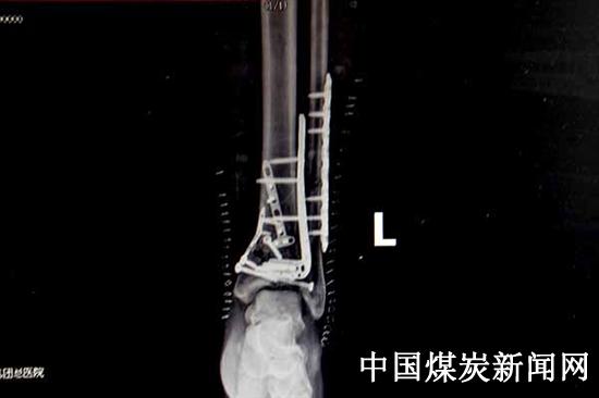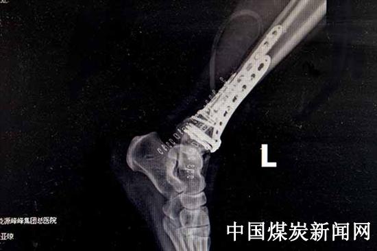 患者在当地医院没有进行牵引,只进行了粗糙的处理,了解了患者情况后,峰峰集团南院区骨三科医护便立即给以皮肤微波局部理疗、药物消肿、开展牵引,采取制动来保护踝关节。避免进一步损伤,随即他们开始了各项系统、规范、专业的治疗。面对患者家属避免残疾迫切要求,手术前一天,娄洪亮主任组织主治医师李治国、大夫刘世东等用了三个多小时详细讨论分析患者病情,认真查看患者检查材料,研究患者踝关节损伤情况、详细制定手术方案,一方面能不上外架的就不上,为患者节约开支,另一方面还要采取有效措施保证治疗效果,以最佳的方案尽可能为患者节省费用。10月9日,骨三科的大夫们行Pilon手术,双切口多入路360度全包围复位,通过钢钉一个个固定粉碎的骨折碎片,用钢板固定患者骨折部位,慢慢把塌陷粉碎的关节恢复形状……。手术从上午9点一直到下午3点半,六个多小时的手术逐步完成了对患者极度粉碎性骨折的左踝关节的固定和复位。在大夫们忙碌的同时,骨三科的郭振萍护士长也在跑前跑后忙碌着联系医院相关科室开展扶贫救助的申报,对治疗费、手术费、床位费等项目申请给予5%-50%的减免,进一步减轻这一困难家庭负担。
