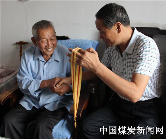 在全国上下纪念抗战胜利70周年,谈起当年的的抗日经历,老人情绪高亢,往事历历在目。图片1:陈永民总经理给徐廷耀老人佩带纪念章 图片2:矿区领导同焦占奎老人合影