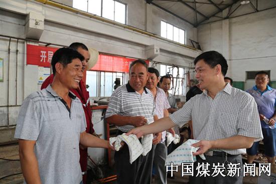 “工友们,休息一会!黄主席来给大伙送清凉了!”7月14日,在中煤集团大屯公司徐庄煤矿徐机电科场地,党支部书记肖学彬招呼正在场地上干活的工友们。