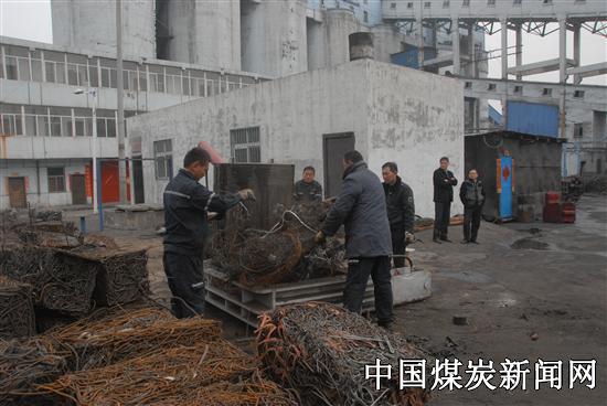 2月23日,在河南能源义煤公司常村煤矿井口地面广场,该矿运输区的职工们手持钢叉、钢钩,将一堆堆废旧的铁丝网运到一个加工设备旁,不一会儿,这些杂乱的铁丝就被加工成了重一二百公斤的铁块。