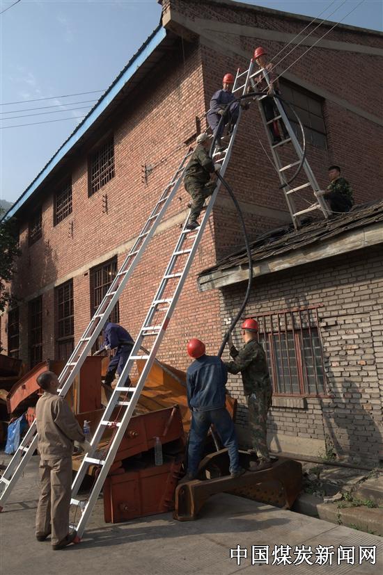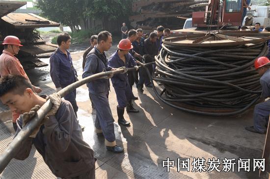 【本网讯】为给大型吊车提供作业的空间,避免吊运货物时吊车长臂触到高压电线击伤工作人员,9月4日,川煤集团攀煤花山矿机电科50余名工作人员顶着炎炎烈日,将重达10余吨的1000米高压电缆成功架向高空。