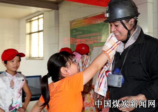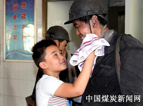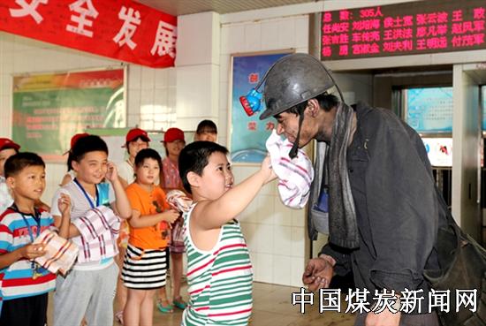 “叔叔、伯伯辛苦了!”孩子们稚嫩的祝福声和那一个个高举过头的毛巾要为矿工擦汗举动,瞬间在刚刚升井的矿工人群中成了一道动人的风景。