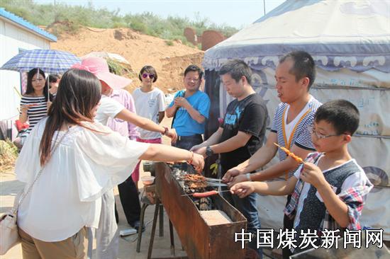 几名年轻的职工看着看着也“蠢蠢欲试”,自己也自封“大厨”模仿着开始烤肉,小孩们也是串起香肠在那里试了又试,一批又一批的烤肉相继出炉。几名职工家属自愿成为了志愿者,忙着将烤肉、水果、黄瓜等食物轮番的送给坡下的参战选手及周边蒙古包里下棋娱乐的职工……