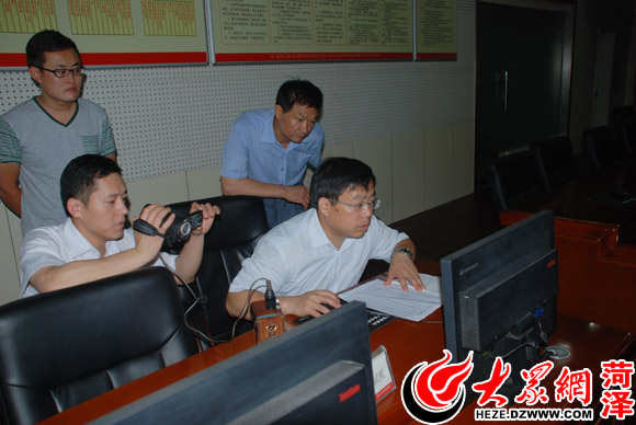 菏泽市煤矿安全执法支队队长王新杰检查值班人员轨迹并做记录