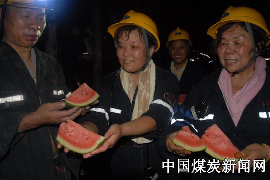 女工委员史红梅说:“进入夏季以来,天气炎热,为了表达我们女工家属协管员对矿工的关心和关怀,我们协管会相继开展了一系列送清凉活动,我们先后到井口、区队值班室给职工们送西瓜、送绿豆汤……今天我们来到生产一线,给职工们送西瓜、绿豆汤、班中餐,也表达了我们协管员对职工的一片关爱之情。我们协管员们祝愿我们的矿工师傅们‘高高兴兴上班去,平平安安回家来。’”