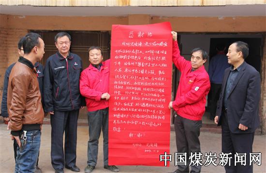 当天,职工史海涛升井后清点衣物丝毫无损,他万分感动:“因前一天去韩城市办事,顾不上将钱物放在家中。一大早从韩城下车就到队上点名上班,换完工装后没有锁更衣箱,就急着赶乘人车下井。升井后看到自己衣物完整,多亏了浴池职工高度的责任心和优质服务矿工的精神,挽回了丢失衣物的损失,谢谢大家!” 图片为 史安涛(前左一)送感谢信场景。
