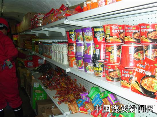 我来到井下930平台的超市,只见一条宽2米,长约15米的联络巷被粉刷一新,两头分别装上了带有风窗的门,乍一看就像进了谁家的新窑洞一般,洞内一侧放着一排三层的货架,上面摆满了桶装方便面、麻花、干膜片、锅巴和各种小面包,还有乡巴佬的卤蛋、泡椒凤爪、鸡腿、火腿肠、花生米以及矿泉水、奶茶、营养快线、果汁饮料等30多种小吃饮料,琳琅满目,应有尽有,要不是井下不允许,带上烟酒简直和地面超市没什么两样。超市里装有防爆热水器、洗手池和餐桌等,这样就形成了一个井下快餐厅。每当采掘一线职工班中整理完毕都会聚在这里泡一碗热腾腾的方便面,吃上一包脆麻花,冲上一杯热奶茶,聊上几句开心的话,工作的疲惫早已抛到九霄云外。吃饭的工人常说:这里的东西比地面还便宜,时不时的还能换换口味,没想到现在在井下干活还能这么滋润,想一想在老系统那阵子,弟兄们吃了那么多苦,能坚守到现在也真是值了。