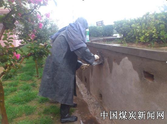 上午8时30分,小区主任带领员工迅速赶到小区广场北墙蜂窝处。为尽快将土蜂窝摘除,减少对小区居民的伤害,小区主任快速制定了一套灭蜂方案。班长白天龙身先士卒,身穿雨衣、头戴面罩、手戴手套立即投入到灭蜂战斗中,其他员工挨家挨户通知未关窗户的居民将窗户关闭,防止摘除土蜂窝时,激怒的土蜂进入家中伤人。灭蜂过程中,白班长先用灭蚊剂将土蜂全部喷射,效果不佳。随即用开水对蜂窝进行浇灌,可是效果仍未见到成效,后用汽油、火烧等方法进行灭蜂,才起到了一定的成效,随后用铁锹将地下的蜂窝全部清除,再进行重新掩埋,最后彻底捣毁了土蜂窝。