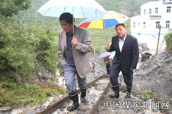 选运区选煤楼陕北村区域下,是该矿铁路运输的咽喉要道,据选运区队长汇报,该处已有垮塌迹象,严重威胁铁路运输。在去往选运区灾情现场的路上,因为大雨道路泥泞不堪,又是上坡路,却并没有阻止一行人前进的脚步,走到险情发生地,李建荣,相里中华一边询问选运区长灾害发生情况,一边指示随行来的相关科室人员立即拿出抢修方案,待抢修工作落实后,一行人又对另一区域进行排查,当走到去往医院的“温馨路”段,发现护坡垮塌,随即安排相关人员监护,在得知“老车队”一住户家因为滑坡导致房屋垮塌后,一行人立即赶往现场,待妥善安置住户后,又赶往另一现场。此时另外几组“三防”队员将排查情况也一一上报到三防指挥部。为了深入了解险情,“三防”队员多次深入住户家现场了解情况,并认真作好记录,以便及时解决。
