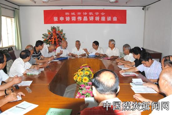 本网讯 9月20日,陕西陕煤韩城矿业公司退休职工张申个人诗词作品评析座谈会在韩城市司马迁图书馆召开,市诗歌学会30余名会员对其诗词作品进行了评析,评析座谈会由韩城市文体局原局长、市诗歌学会会长孙升主持。 今年64岁的张申系河北安平人,退休前任我局煤研所通信工程师,喜好诗文,退休后笔耕不辍,有多部诗词作品在省、市、地区报刊杂志上发表,并曾获得过奖励。