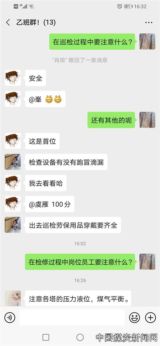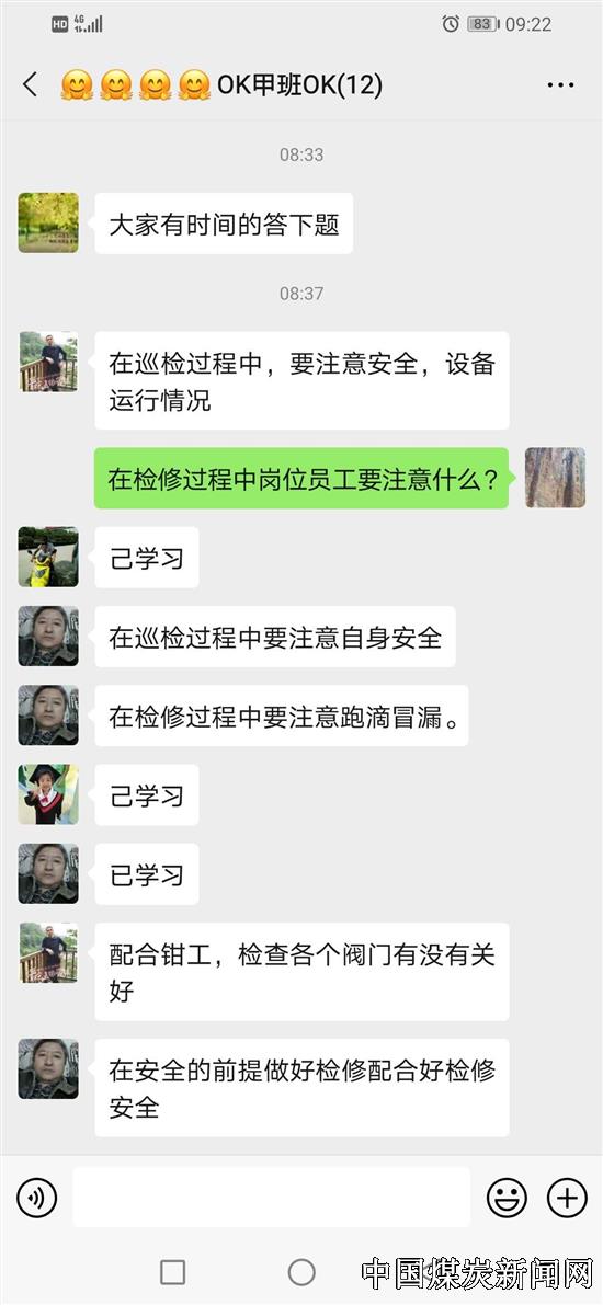 “检修过程中,岗位员工需要注意什么?”“在巡检过程中要注意自身安全,在检修过程中要注意跑冒滴漏。”“配合钳工,检查各个阀门有没有关好。”在4月3日星期五这天,炼焦车间副主任肖发明正用手机通过车间工作微信群,与员工们进行安全环保思想教育互动答题学习。