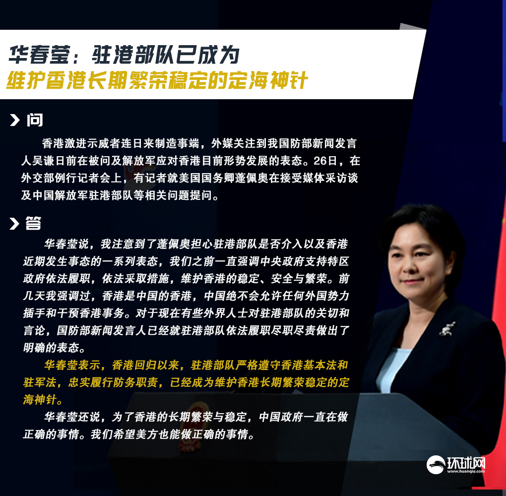【环球时报-环球网报道 记者 张骜】香港激进示威者连日来制造事端,外媒关注到我国防部新闻发言人吴谦日前在被问及解放军应对香港目前形势发展的表态。26日,在外交部例行记者会上,有记者就美国国务卿蓬佩奥在接受媒体采访谈及中国解放军驻港部队等相关问题提问。对此,中国外交部发言人华春莹进行了驳斥。