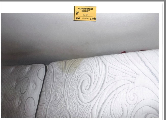 FBI鉴识专家马盖尔(Michael Maguire)在法庭上,逐一说明在被告公寓出现荧光反应的位置,其中包括在卧室床边的墙壁发现手印,以及卧室床垫及地毯下有疑似血迹等。他说,这些发现后来均被送去检测。