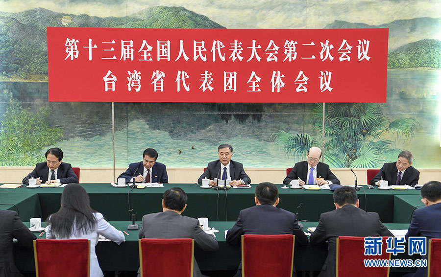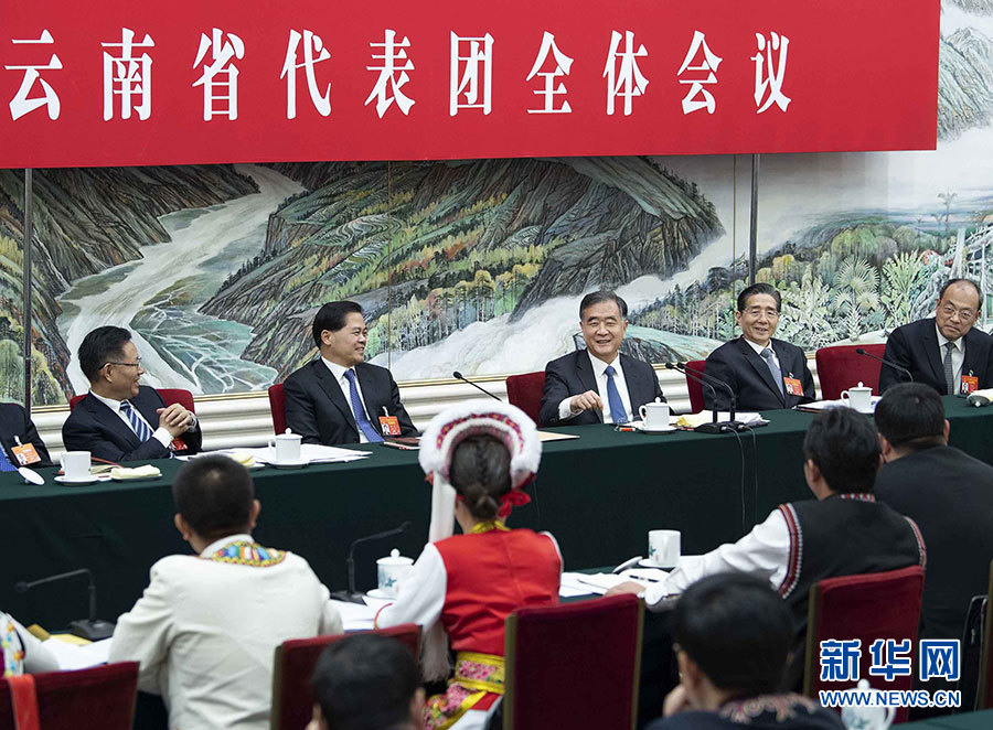 汪洋分别参加台湾代表团、云南代表团审议。在台湾代表团,汪洋在认真听取符之冠、陈云英、陈军等代表发言后指出,习近平总书记在《告台湾同胞书》发表40周年纪念会上的重要讲话,是指引新时代对台工作的纲领性文献。要学深悟透讲话的精神实质和核心要义,深刻认识两岸统一是历史大势,牢牢把握对台工作正确方向。要广泛深入听取台湾同胞的意见,完善配套政策,把促进两岸经济文化交流合作“31条措施”等惠台举措落到实处,深化两岸融合发展。要坚持一个中国原则和“九二共识”,坚决反对“台独”,团结更多台湾同胞共担民族大义,为推动两岸关系和平发展、推进祖国和平统一进程作出更大贡献。在云南代表团,汪洋认真听取阮成发、马正山、玉龙等代表的发言,充分肯定过去一年云南改革发展取得的成绩。他希望云南深入贯彻习近平总书记对云南工作的重要指示精神,坚定不移落实党的民族政策和宗教工作基本方针,大力帮助人口较少民族和“直过民族”发展,努力打造民族团结进步示范区。要坚决打好脱贫攻坚战,努力攻克深度贫困堡垒,着力提高脱贫质量,确保全面小康路上一个都不掉队。