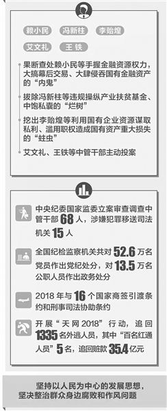 报告说,中央纪委国家监委围绕打赢三大攻坚战,果断查处赖小民等手握金融资源权力,大搞幕后交易、大肆侵吞国有金融资产的“内鬼”;拔除冯新柱等违规操纵产业扶贫基金、中饱私囊的“烂树”;挖出李贻煌等利用国有企业资源谋取私利、滥用职权造成国有资产重大损失的“蛀虫”。