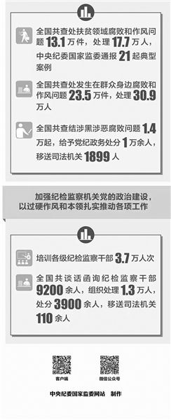 除此之外,报告提到,2018年全国共查处扶贫领域腐败和作风问题13.1万件,处理17.7万人,中央纪委国家监委通报21起典型案例,为打赢脱贫攻坚战提供了坚强纪律保证,同时,制定实施2018年至2020年开展扶贫领域腐败和作风问题专项治理工作方案,强力纠治扶贫领域形式主义、官僚主义和弄虚作假等突出问题,惩治在扶贫项目中贪污侵占、虚报冒领、截留挪用等违纪违法行为。