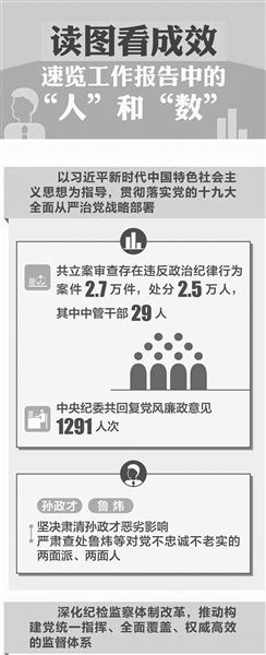 报告指出,中央纪委国家监委立案审查调查中管干部68人,涉嫌犯罪移送司法机关15人;全国纪检监察机关共对52.6万名党员作出党纪处分,对13.5万名公职人员作出政务处分;艾文礼、王铁等中管干部主动投案,党的十九大以来共有5000余名党员干部主动投案。