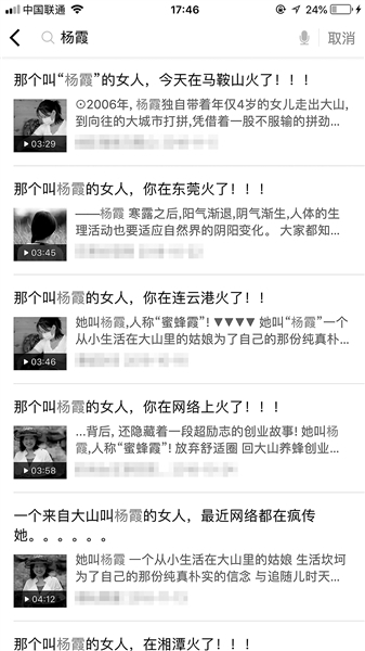北青报记者搜索发现,今年上半年开始,“杨霞”就开始频频刷屏朋友圈。连云港、东莞、马鞍山、湘潭、哈尔滨……这个叫“杨霞”的女人,先后“走红”全国多个城市,甚至还在书法圈、风水圈、球迷圈“引起轰动”。