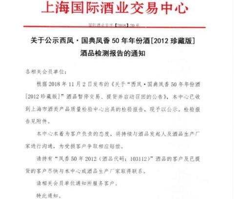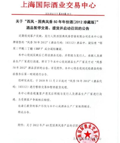 11月7日,上海国际酒业交易中心发布了对“西凤国典凤香50年年份酒【2012珍藏版】”(下称“西凤年份酒”)的检验报告。报告显示,西凤酒送检的3瓶年份酒两项塑化剂均超标近三倍。
