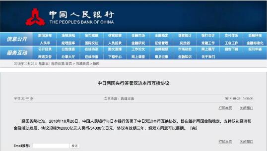 经国务院批准,2018年10月26日,中国人民银行与日本银行签署了中日双边本币互换协议,旨在维护两国金融稳定,支持双边经济和金融活动发展。协议规模为2000亿元人民币/34000亿日元,协议有效期三年,经双方同意可以展期。