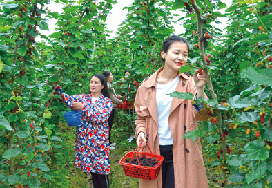 ▲江西省樟树市爱农湖生态主题乐园内,市民在体验采摘桑葚之乐。