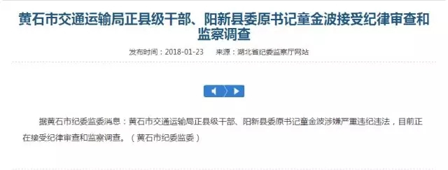 2018年1月23日,湖北省纪委监察厅网站发布消息:黄石市交通运输局正县级干部、阳新县委原书记童金波涉嫌严重违纪违法,目前正在接受纪律审查和监察调查。