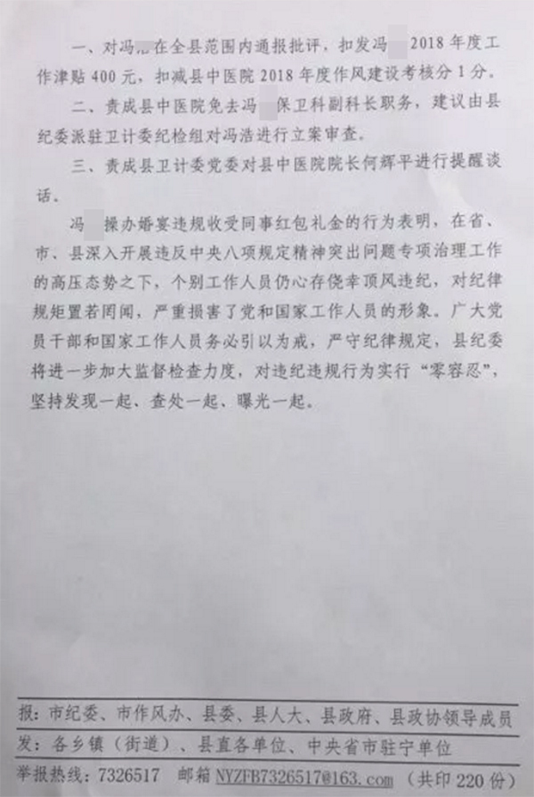 一、对冯某在全县范围内通报批评,扣发冯某2018年度工作津贴400元,扣减县中医院2018年度作风建设考核分1分。