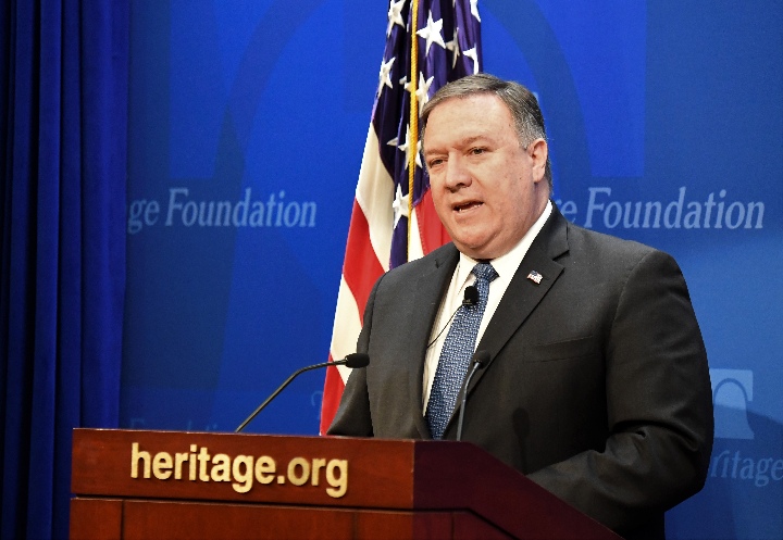 5月21日,美国国务卿蓬佩奥在华盛顿的美国智库传统基金会发表演讲。(新华社记者杨承霖摄)
