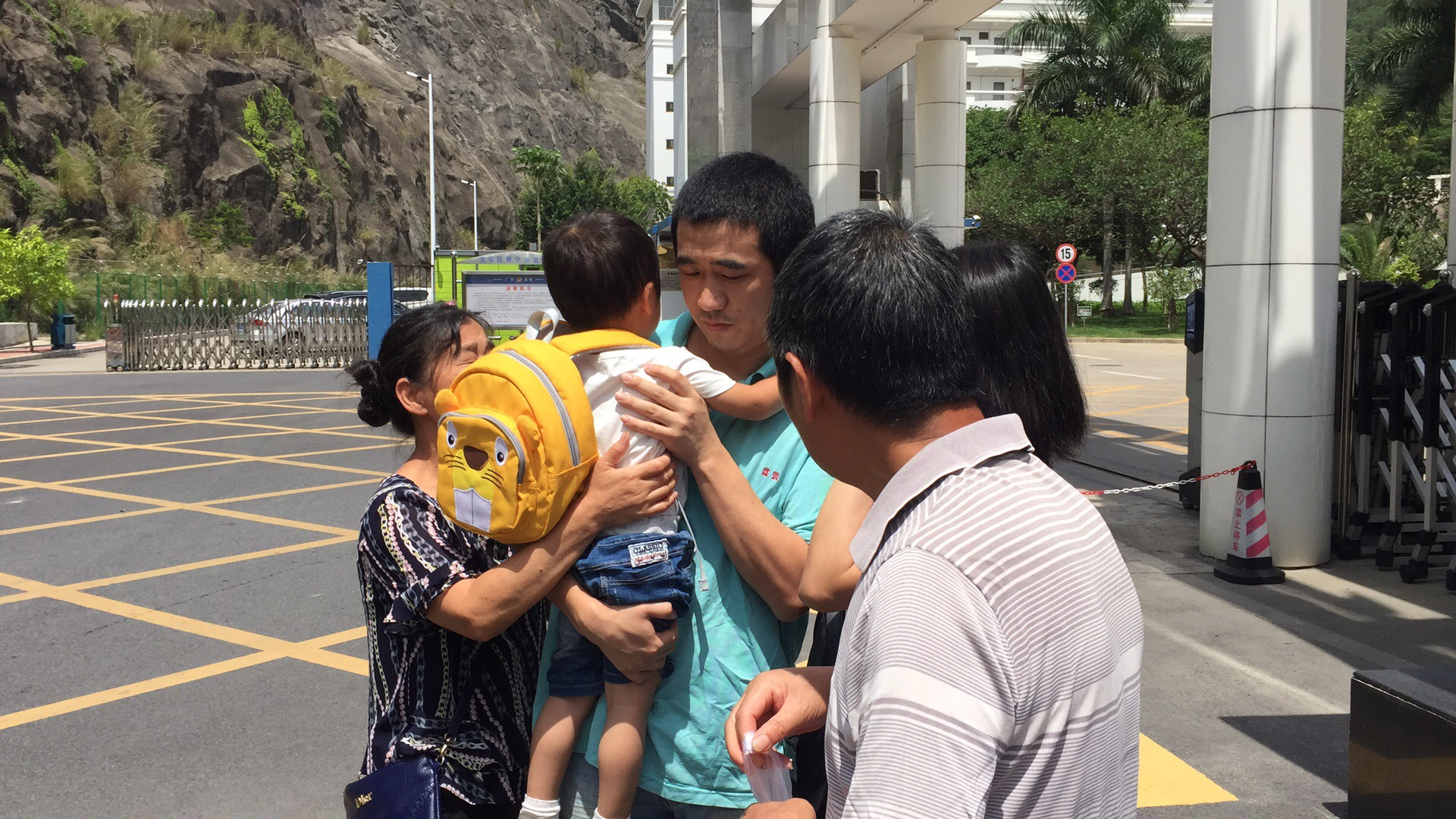 王鹏左手撑着太阳伞,右手搂着妻子任盼盼和儿子,和父母一起慢慢走回家。