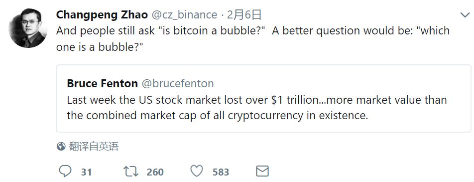 比如在前天(2月6日),赵长鹏在个人推特上“颇有深意”地转发了一条状态。原文写道,“美国股市上周市值蒸发1万亿美元,这比所有虚拟货币总值还高。”