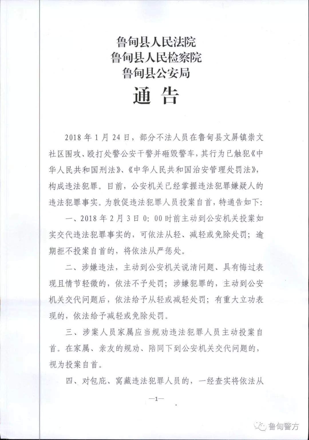 1月25日,云南省昭通市鲁甸县公安局通过官方微信公众号“鲁甸警方”发布通报,通报中,当地公检法联合发通告称,1月24日,部分不法人员在鲁甸县文屏镇崇文社区围攻、殴打处警公安干警并砸毁警车,其行为已触犯刑法和治安管理处罚法,构成违法犯罪,敦促不法者限期自首。