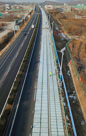 今年9月29日,该公司同在山东济南建成了中国首条光伏路面示范区,历时10个月完成了660平方米路面的铺设并实现并网发电。同时,该示范区还配备了电动汽车充电桩、智能引导标线等衍生应用设施,是中国首例光伏路面试验段,也是全球首条全路幅宽度铺设的光伏路面。
