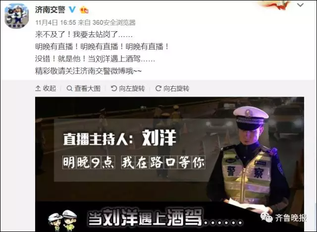 论“搞事情”,最服的还是山东济南交警蜀黍们,据齐鲁晚报11月6日报道,5日晚上,他们进行了一次夜查酒驾行动,并且还全程进行了直!播!不仅如此,在直播前一天还发布了预告。
