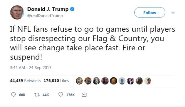 但早已经“身经百战”“见得多了”的特朗普没有因此而闭嘴,反而继续在自己的推特上发言说:“每个爱国的球迷应该抵制职业橄榄球联赛,直到那些亵渎我们国歌和国旗的恶行被彻底制止”。