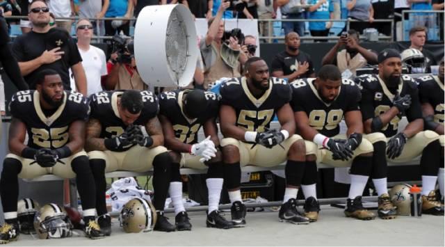 结果,事情就这样被彻底激化了:在昨天的橄榄球比赛日中,众多职业橄榄球大联盟的球员们纷纷在奏国歌时要么手拉手、要么单膝下跪、要么干脆坐在板凳上不起来,以表达他们要团结一心,对抗特朗普和种族歧视的决心。