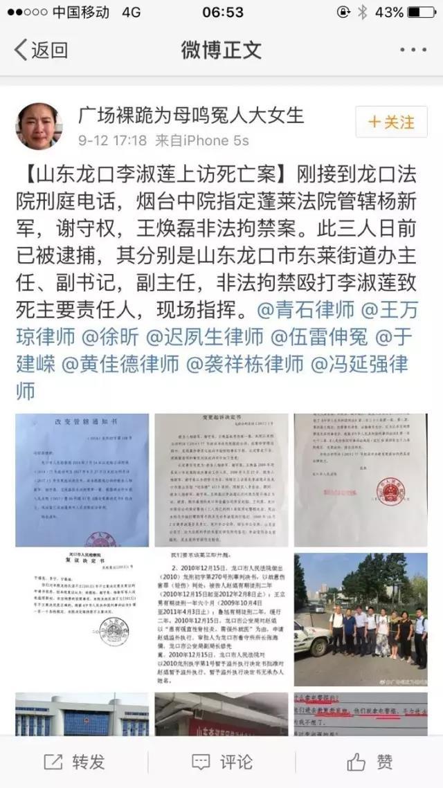 李淑莲2002年拒绝龙口市某局领导索贿,厄运就降临了。她的仓库被人放水淹掉,商店被封,性格耿直的她多次上京反映受恶吏打压的情况。随后发生的一切就在预料当中,她所在街道办官员将其骗回,关押在宾馆,变相禁锢,最终放任恶棍逼死李淑莲。