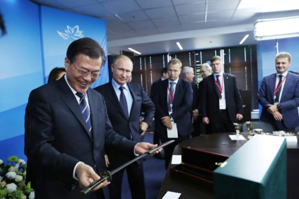 海外网7日援引韩国NEWS1网站消息报道,6日,正在俄罗斯访问的韩国总统文在寅收到俄罗斯总统普京的一件特殊礼物:朝鲜时代打造的宝剑。据报道,这把剑最初打造于18世纪朝鲜王朝时代,上世纪50年代经美国人之手流出至美国后,又被俄罗斯人买去,最后被俄罗斯政府获取。如今普京又把它作为礼物,送给了韩国现任总统文在寅,可谓一波三折、命途多舛。