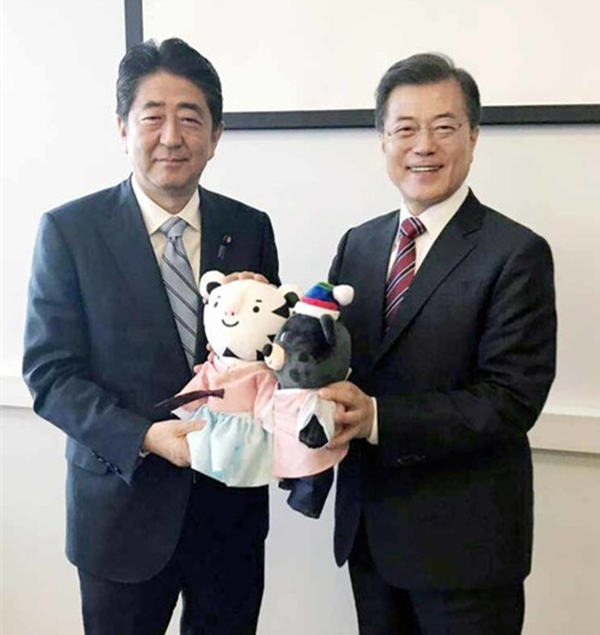 7日,文在寅送安倍平昌冬奥会吉祥物。