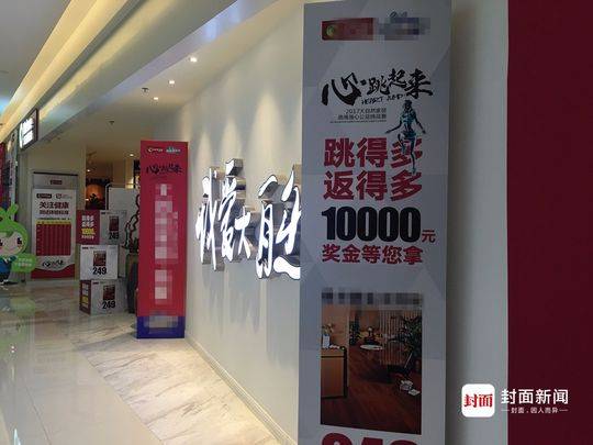 26日下午1点过,记者来到事发店铺,看到店门外仍然放着多个跳绳促销活动的广告牌,“心跳起来,跳得多返得多”字样十分醒目。