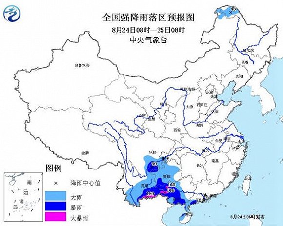 降水预报:8月24日08时至8月25日08时,广东西南部、广西西部和南部、海南岛西北部、云南南部和东部、四川东南部、贵州大部等地有大到暴雨,其中,广西西部、云南东南部等地的部分地区有大暴雨(100-180毫米),上述大部地区有短时强降水,小时最大降水量50~70毫米。