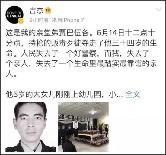 这是我的亲堂弟贾巴伍各。6月14日十二点十分点,持枪的贩毒歹徒夺走了他三十四岁的生命。人民失去了一个好警察,而我,失去了一个亲人,失去了一个生命里最踏实最靠谱的亲人。