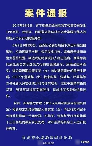 图为杭州西湖警方发布董某某带人殴打前同事案的通报。