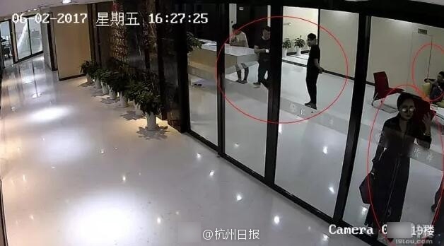 监控视频显示,一名面容较好的女子穿着黑色长裙、高跟鞋,戴着大墨镜,于6月2日16时27分进入涉案公司,身后紧跟着5名男子。进门时,该女子与2名男子去前台,另外几人坐在公司前厅的沙发上。随后,该女子离开前台双手背在身后,在前厅走来走去,不时向公司内的工作人员打招呼示意开门。16时30分,5男子中最纤瘦的一人从前台后面一处隔断中挤入办公区域,随后从内部打开门禁,该女子双手背在身后昂首进入办公区,身后2名男子紧跟她身后进入。前台人员试图阻拦,被一名男子一把推开,后面3男子留在前厅等待。16点38分,该女子带头走出办公区域,5男子跟着她离开公司。