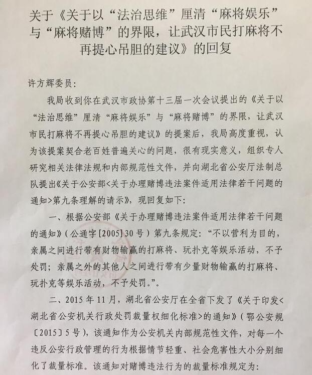 5月17日,全国首例"麻将政协提案"获武汉市公安局治安管理局回复。