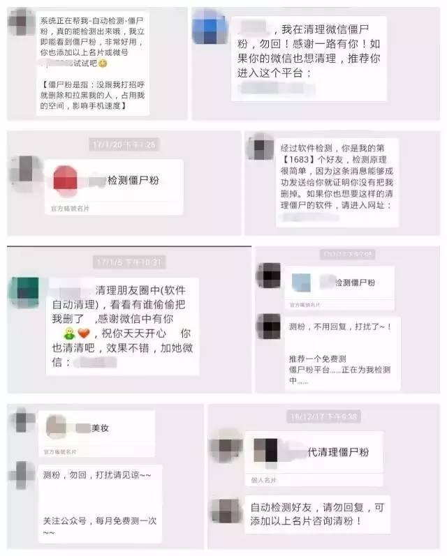 4、对方用来为自己的微信号引流,有“业内人士”甚至发出微信公众号解释了整个操作过程:帮人检测僵尸粉,利用清粉的理由去群发广告,广告的内容是名片+文字。引更多的人来检测僵尸粉,关注公众号之后,引导他们去添加检测僵尸粉的客服,然后加客服个人号继续检测和裂变。