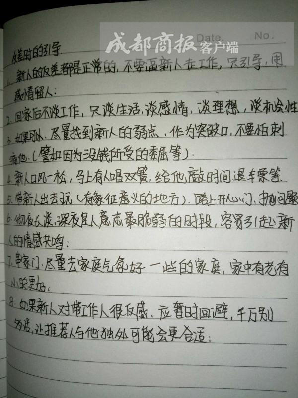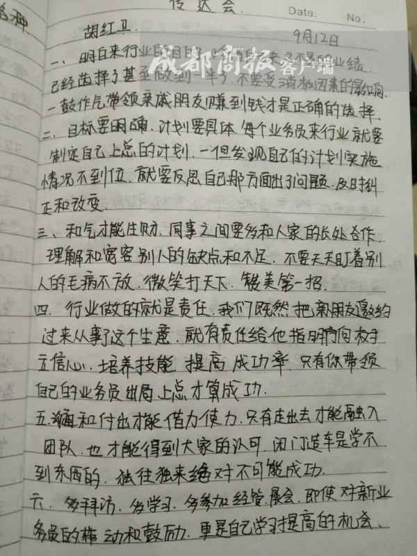 手机: 每天要查三遍,早上9点一次,中午一次,晚上10点一次,一般情况下,如果朋友圈发现了关于“家里”的信息,主任罚款50元、经理人罚款100元、总管罚款300元。有一次,一个主讲人冲着田冲喊,“你拿个手机干嘛”。士兵出身的田冲把手机翻过来,“没干嘛,玩呢”。 为了应对检查,他买了两个手机,一个用于检查上交,一个放在衣兜里,设置了指纹锁,通过这种方式,他成功录制了10G的音视频资料。 “担心暴露,咋可能不担心呢。”当被问到暴露怎么办,田冲说,他早就准备了一条下下策,“如果暴露,我就拿菜刀把里头的人挟持了”。 导师正在授课 互相拜访: 整理出4万字资料 记下42个房号 “马云、雷军这些名人都是从传销里走出去的,传销就是要培养现代化高级人才。”视频课,是传销组织里的必修课,这些像素成渣的视频,将一些国庆阅兵、中央会议的视频切割,然后配上不搭界的讲解。 田冲将一段视频点开,开头就是风声萧瑟的背景乐,然后解说着,“在祖国大陆正在蔓延一场没有硝烟的战争,一支不穿军装的部队,一所没有围墙的大学,一个打造亿万富翁的摇篮,吸引了大批志士,忍辱负重,积极运作,成功地构筑着祖国的经济长城。” 里面的人都相信,传销是“国家政策支持”下的一种新经济,各个“家庭”之间,还要相互拜访,提高知识水平。在一段视频中,两位妇人坐在一起,拉起了家常,“这可能又是一次商机来了,我们应该去搞清楚,不给自己留遗憾,对不对?” 一段视频中,在租住房里,只有沙发、桌子,几件简单家具,一名穿着黑色夹克的男子,还拿着一只笔在纸上边画边介绍,“五万块能做什么生意!”他告诉旁边坐着的女子,“现在门面很贵的,还有人员和装修费用”,他直言,国家现在引进传销经济,撬动民间之本,就是促进货币流通,“如果思想跟不上时代脚步,注定要被淘汰”。 每天互相拜访,田冲跟着一起嘻嘻哈哈,他每到一个地方,都把房号抄写下来,在万景峰和上锦颐园,他一共抄下了42个房间号。据他介绍,小区中大概有200多个人(在从事传销),一般4个人租住一间房,“春节到现在,又多了20多个人”。 几位“家庭成员”在给新成员传授经验。