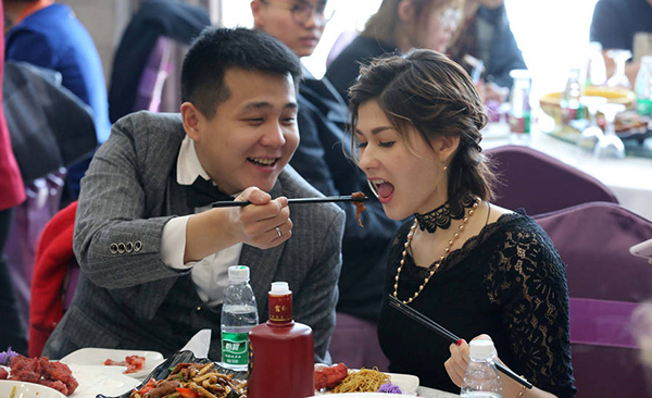 2017年3月,黑龙江黑河,边城黑河市28岁男子陈景阳与自己的22岁俄罗斯新娘子休莎在酒店举行了简单而又正规的结婚答谢宴。亲朋好友一致夸赞休莎漂亮、大气、高素质的同时,也纷纷为陈景阳“不用房,不用车,用99朵玫瑰花抱得美人归”的感到欣慰。