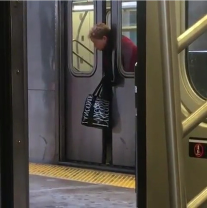 近日,美国纽约地铁里就出现了这样的情境:在纽约地铁四号线上,一位妇女很“偶然”地被门夹在了中间,头和手部露了出来,手上还提着一个包。