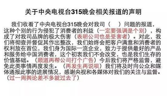 每年“3·15”晚会都会曝光大量损害消费者权益的事件,涉事公司往往会第一时间出面发声。对此,网友已总结出了各大企业公关的基本套路:高度重视,立即调查处理,决不姑息,加强管理,深化落实,切实保证,努力营造,感谢监督……